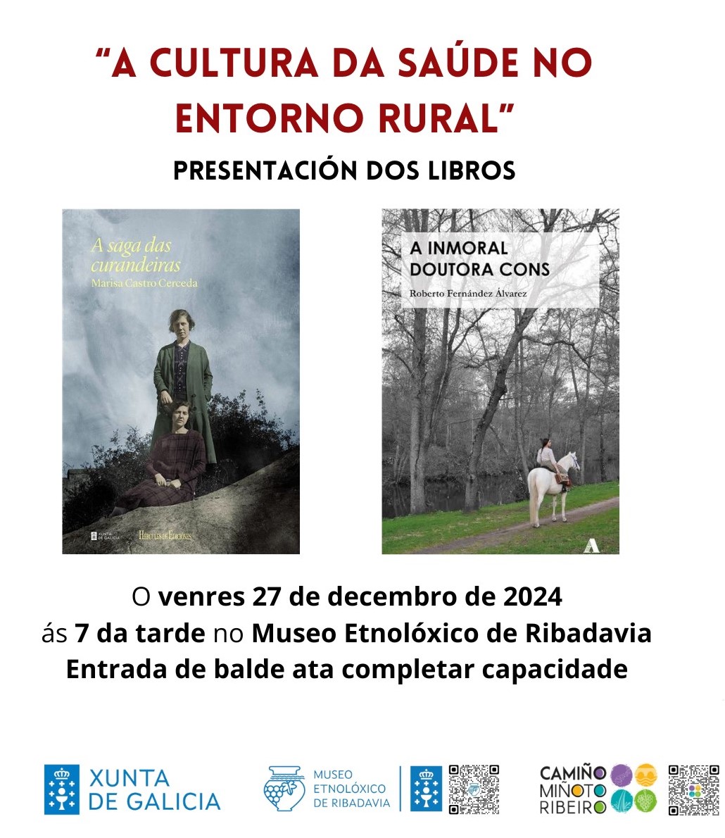 Con el título genérico de "A cultura da saúde no entorno rural", se presenta, por una parte, el libro "A saga das curandeiras", de Marisa Castro Cerceda, y por otra parte, el libro "A inmoral doctora Cons", de Roberto Fernández Álvarez.