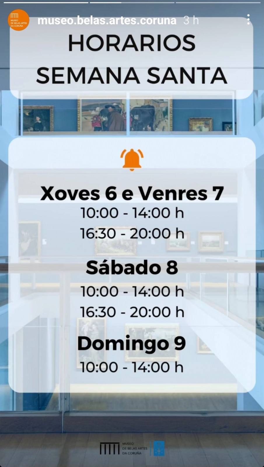 El Museo de Bellas Artes de A Coruña contará con un horario de apertura especial en Semana Santa. Con motivo de la exposición: Picasso, Blanco en el recuerdo azul el museo abrirá sus puertas los festivos siguientes: