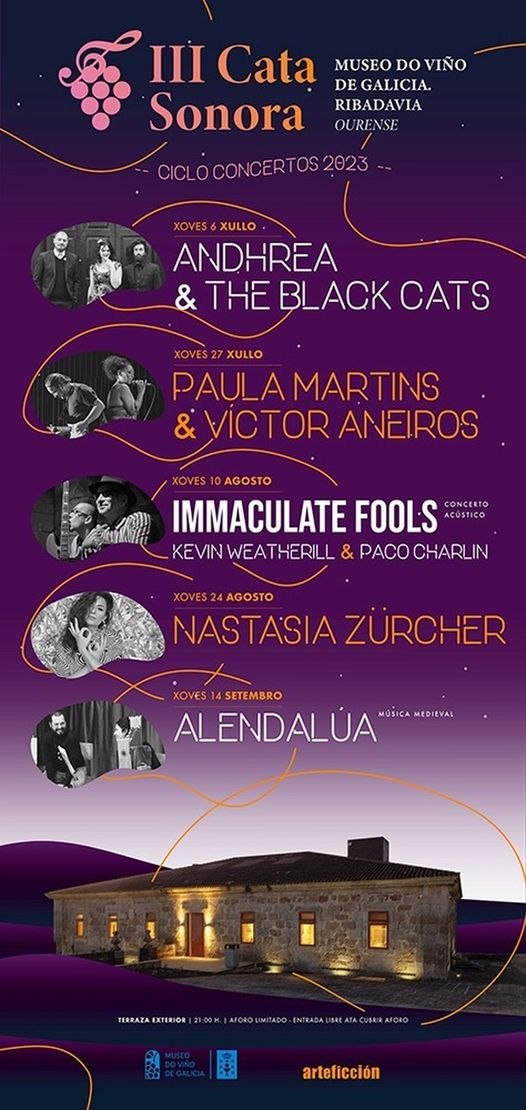 Por tercer año consecutivo tendrá lugar en el Museo del Vino de Galicia una nueva edición de la Cata Sonora, un ciclo de conciertos de muy diversos géneros musicales como el blues, el pop o el rock, y que contará con artistas tanto nacionales como internacionales que compartirán su talento en un recinto incomparable y de gran belleza como lo es la terraza exterior del museo. Esta edición se celebrará durante los meses de verano, desde julio hasta septiembre, y contará con las siguientes actuaciones: