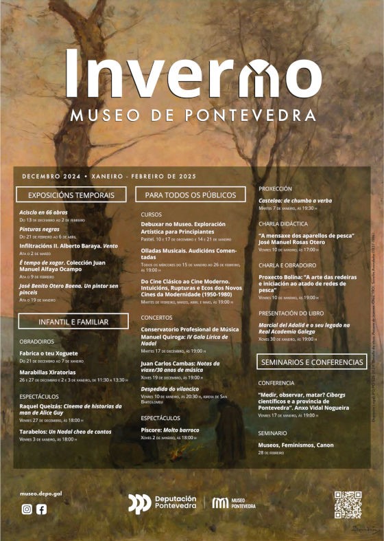 O museo de Pontevedra presenta esta semana a programación de inverno, para os meses de decembro, xaneiro e febreiro. Haberá obradoiros para público infantil e familiar e para persoas adultas, espectáculos, concertos, proxeccións, conferencias... Nas datas de nadal o museo ofrece actividades pensadas para toda a familia, e o 7 de xaneiro arrancan os actos do Ano Castelao, coincidindo co 75 cabodano do intelectual galeguista. O Museo custodia unha parte fundamental da súa obra artística, polo que esta conmemoración é moi importante.