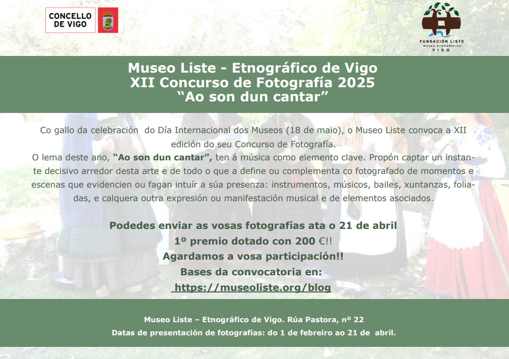 XII convocatoria do Concurso de Fotografía convocado polo Museo Liste de Vigo co gallo da celebración do Día Internacional dos Museos (18 de maio). O concurso pretende fomentar o coñecemento e a creatividade a través da práctica da fotografía co fin de destacar variados aspectos históricos, artísticos, etnográficos e antropolóxicos.
