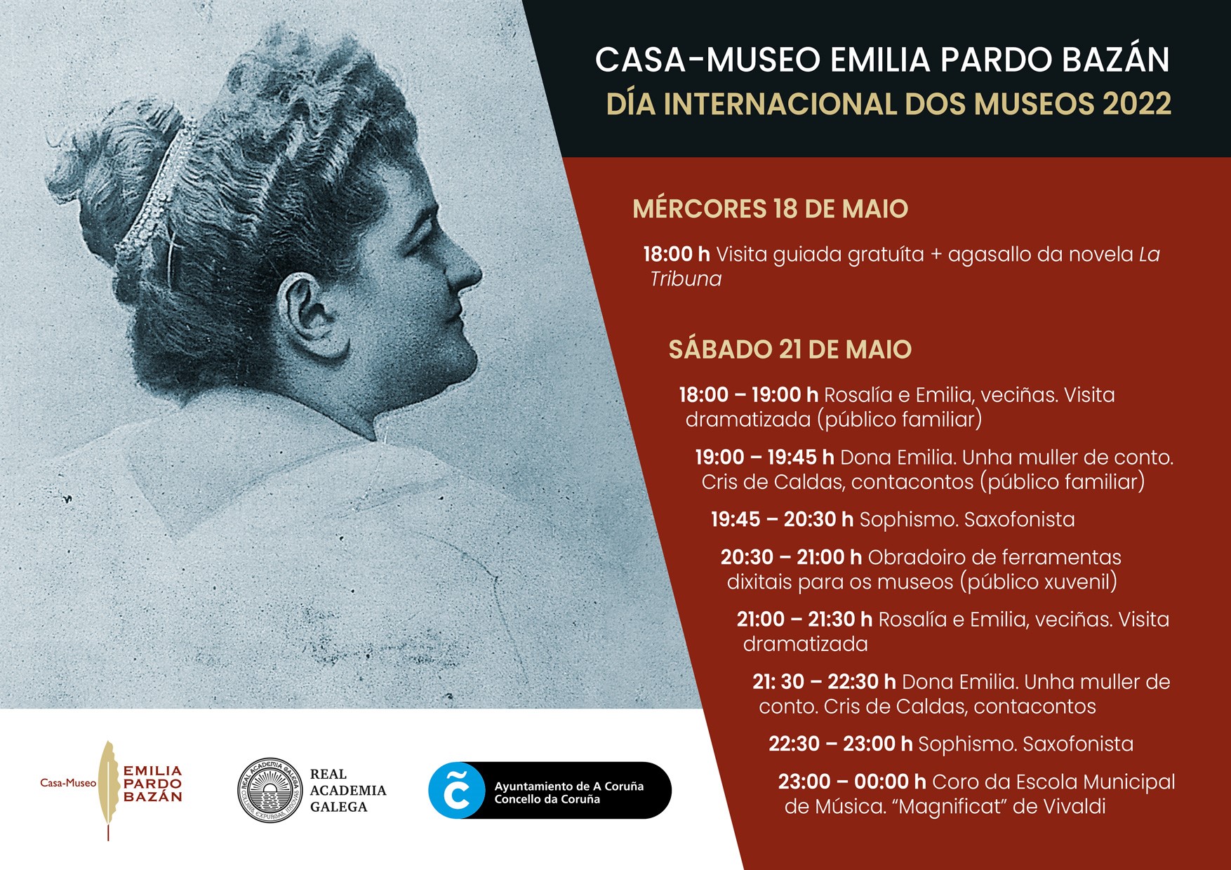 O Día Internacional dos Museos, o mércores 18 de maio, as persoas que participen na visita guiada á Casa-Museo Emilia Pardo Bazán das 18:00 horas recibirán como agasallo un exemplar de La Tribuna, a novela da escritora que inmortalizou as cigarreiras da cidade da Coruña. Xa na fin de semana, o sábado 21 de maio a programación especial arrincará ás 18:00 horas cunha visita dramatizada para público familiar titulada “Emilia e Rosalía, veciñas”, na que Natalia Vázquez Crespo e Judit Barreiro Vilachán interpretarán un diálogo entre Emilia Pardo Bazán e Rosalía de Castro. Ás 21:00 haberá un segundo pase para público xeral.
