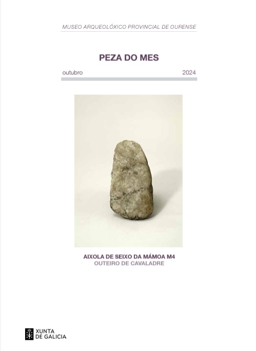 Do 1 de outubro ao 31 de outubro do 2024 - 20:00h Peza do mes: Aixola de seixo. Outeiro de Cavaladre (Muíños, Ourense) Presentación e publicación virtual mensual para afondar no coñecemento dos fondos do Museo Arqueolóxico Provincial de Ourense.