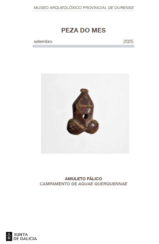 Son moitas as pezas que foron recuperadas no contexto arqueolóxico do campamento militar romano de Aquae Querquennae -Porto Quintela (Bande, Ourense)-. Ao cumprirse o 50 aniversario do comezo das investigacións arqueolóxicas sistemáticas neste xacemento, elixiuse para presentar como «peza do mes» un obxecto atopado nos traballos realizados nel, que se caracteriza pola súa escaseza e singularidade no ámbito peninsular ibérico: un amuleto fálico de ámbar. En concreto, procede da escavación arqueolóxica de 2015 e foi atopado no tramo meridional da calzada interior (via sagularis) que discorre entre a muralla e os diferentes edificios do campamento. As súas características son as seguintes: materia e técnica: ámbar báltico tallado, puído e furado; datación: 74/75 d. C.–ca. 120 d. C.; dimensións: 17 mm (lonxitude) x 12 mm (anchura) x 67 mm (grosor). Pertence aos fondos do Museo co nº de inventario DX1271/9