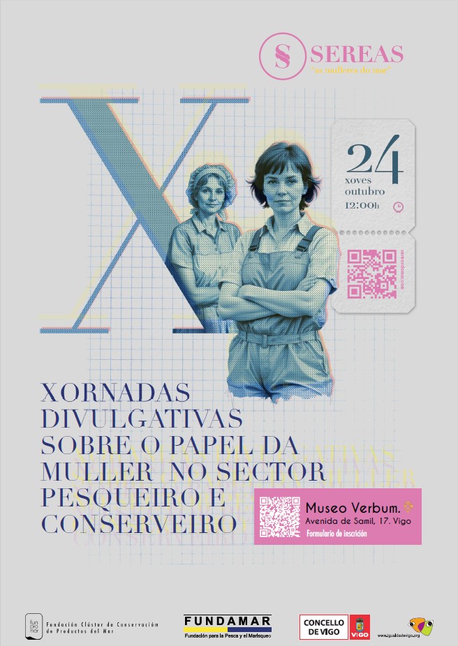 As fundacións FUNDAMAR e FUNPROMAR organizan as X Xornadas divulgativas sobre o papel da muller no sector pesqueiro e conserveiro no marco do programa SEREAS “as mulleres do mar”, ao servizo da divulgación e visibilización da muller no sector mar-industria. O obxectivo da xornada, será homenaxear, como todos os anos, ás novas protagonistas que formarán parte do repositorio SEREAS, grazas a colaboración da Concellería de Igualdade do Concello de Vigo. As xornadas terán lugar o xoves 24 de outubro ás 12:00h, no Museo Verbum de Vigo. Para asistir á Xornada é necesaria a inscrición antes do luns 21 de outubro a través da seguinte ligazón:
