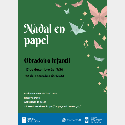 Obradoiros nos que a rapazada poderá facer os seus propios adornos de Nadal empregando técnicas como a papiroflexia. Dirixido a nenas e nenos de 7 a 12 anos.