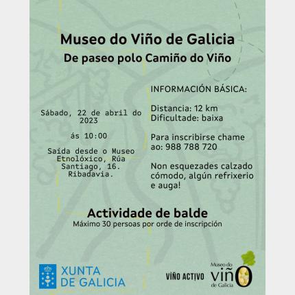 El Museo del Vino de Galicia organiza una ruta a pie de 12 km por el Ribeiro, de baja intensidad, que parte de Ribadavia y pasa por A Veronza, A Quinza y llega a